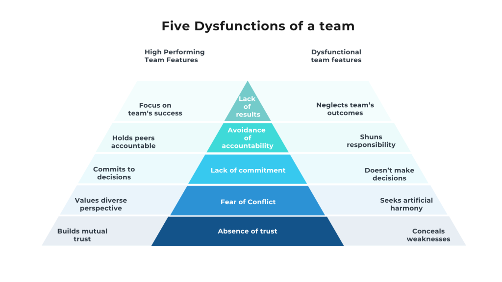 This model highlights the common challenges that can lead to team dysfunctions, as the name implies. It is a framework that helps leaders identify and understand the key pitfalls that prevent teams from reaching their potential, such as a lack of trust, fear of conflict, or lack of accountability.By recognizing and addressing these dysfunctions in advance, our leaders are able to create proactive environments where teams thrive.