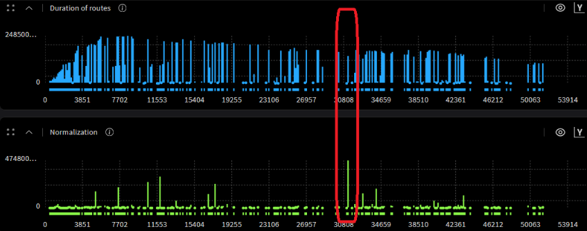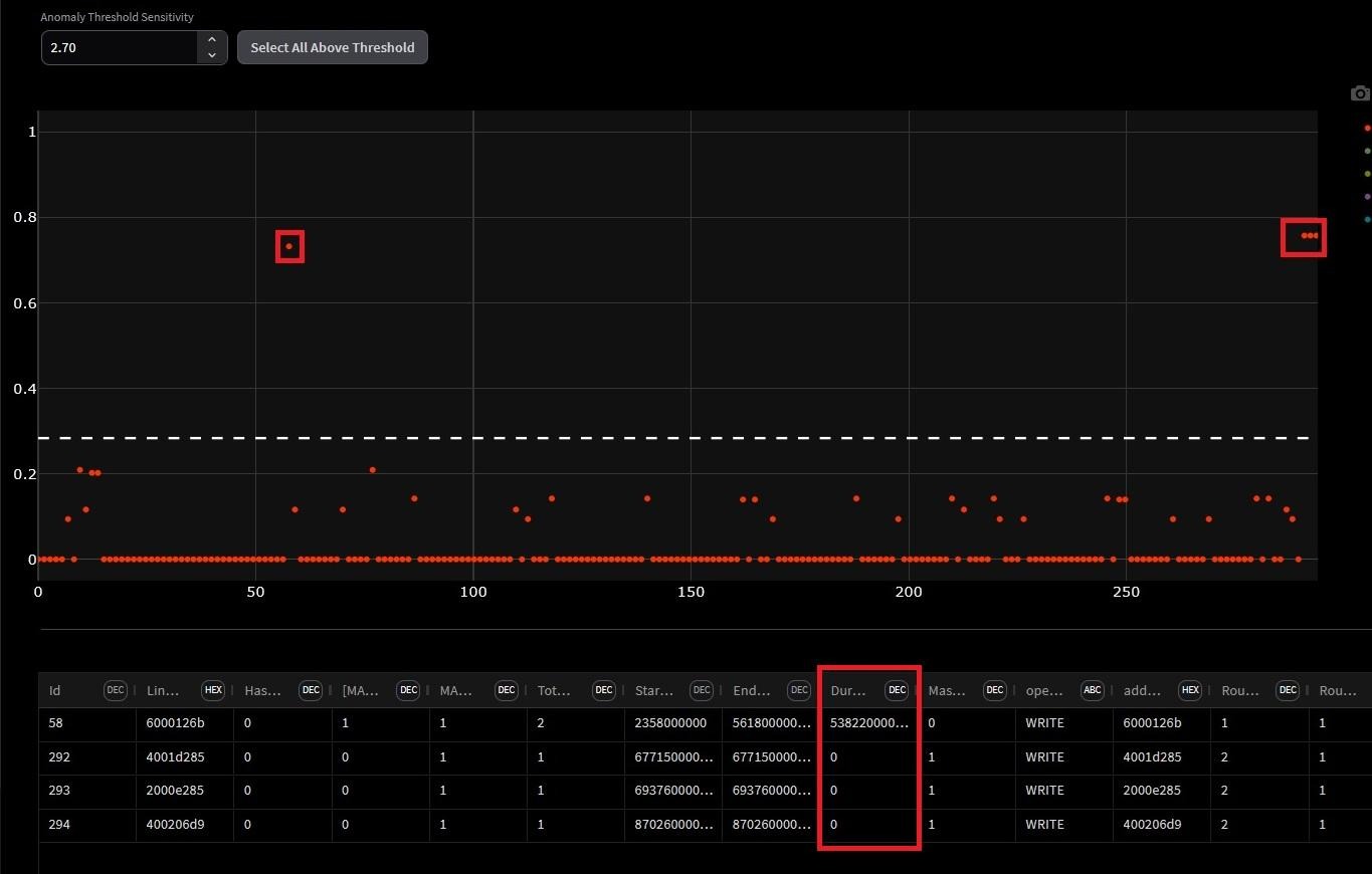 Manual inspection of transaction duration plots doesn't scale. Anomaly detection algorithms across the full route dataset, incorporating initiator index, address, burst length, duration, and other fields can be used to surface statistical outliers automatically.