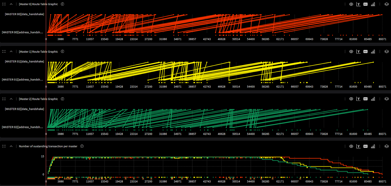 Each line spans from request to response. Dense, parallel lines show that the DUT is under stress. Gaps or sparse regions identify backpressure or traffic generation issues.