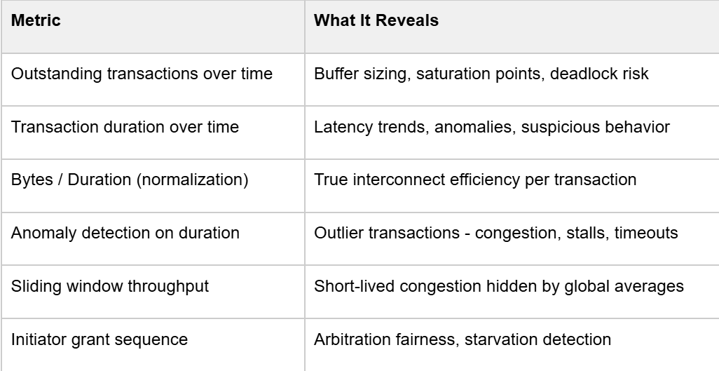 This is exactly what raw latency numbers miss. A transaction can look unremarkable in absolute duration while being severely inefficient in bytes delivered per cycle. This highlighted region gives designers a precise, timestamped target for investigation - the root cause could be arbitration starvation, resource conflict, or a protocol stall, but at least you know exactly where to look.