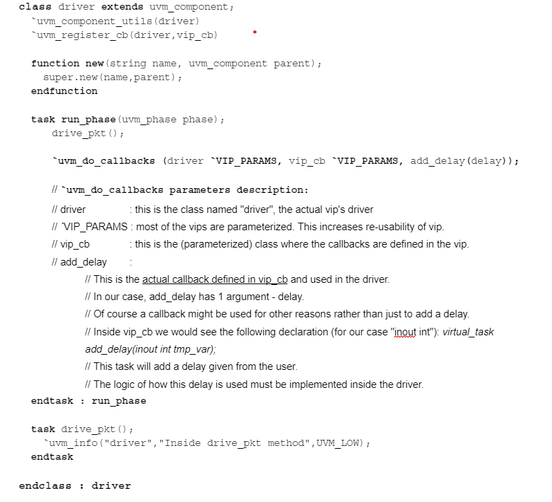 We will not check how to add the callbacks inside the vip (for this case refer to the link above), but rather, how to use it in our test cases. The vip is given.
