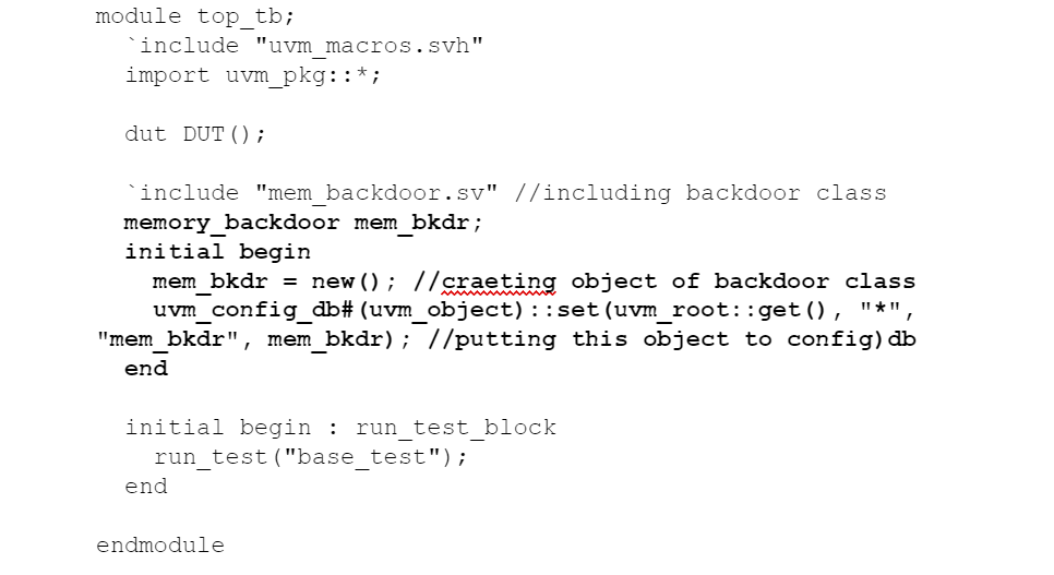 5.And that is all, now you have access by backdoor to memory in our testbenchExample on EDA:https://www.edaplayground.com/x/Rfjn