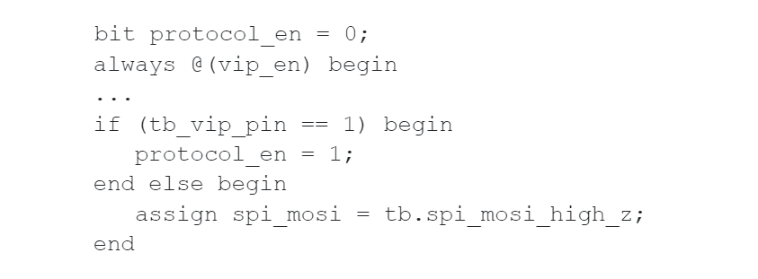 We want to assign to a gpiox pin a signal mosi. We do not want that signal to be assigned during the entire simulation, but only during some trigger event (for desired vip_en and specific protocol)