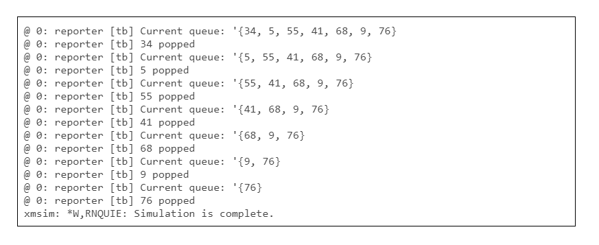 Class example contains a random queue of integers between 1 and 100. The intent of the test module’s initial block is to pop all elements of this queue one by one. In each iteration of the while loop, the whole queue is printed in a uvm_info with low verbosity, while the value returned by the pop_front function is with high verbosity. This will work in case the simulation is started with setting the verbosity level to UVM_HIGH or higher: