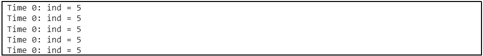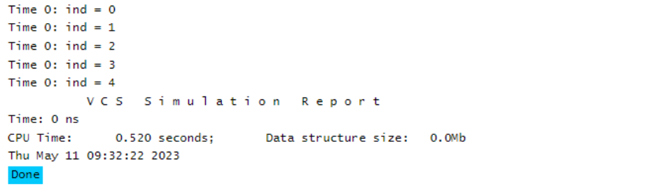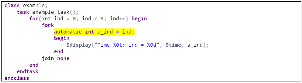 What this means is that all the processes in a fork-join_none block will only start as soon as the block that is calling them (i.e. the parent process) either reaches its end or is blocked by any of the delay/event/wait operators or any other blocking statements. In the example, the consequence of this is that firstly the for loop will be fully iterated (ind reaches 5) and only then all the forked threads created in the loop will actually start, which is why all $displays show ind = 5. Adding another display statement which logs the current value of ind at the start of the “for loop” confirms this effect: