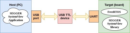 Which application you will decide to use in your system for visual tracing is out of this scope. For example, in order to understand how to build FreeRTOS with a visual tracing mechanism, I made example projects with the SEGGER SystemView real-time recording and visualization tool. SEGGER SystemView has a free non-commercial license and there is a good support community. Also, these examples are done using a NXP mimxrt1170 evaluation board and an ST nucleo-f413zh board, so you can distinguish the steps of porting SystemView library that are the same for every board and those that are board-specific. Traced events are sent via the UART interface from board to host application (see image below).