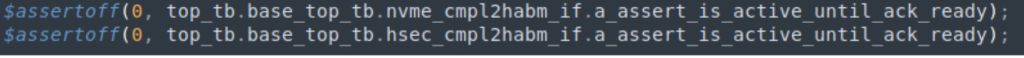 $assertoff: Stop the checking of all specified assertions until a subsequent $asserton appears. An assertion that is already executing, including the execution of the pass or fail statement, is not affected.