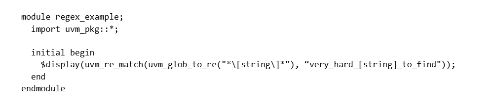 If there’s a match, uvm_re_match returns 0. If there’s no match, it returns 1.We can also use another DPI function, uvm_glob_to_re, which converts a glob-style expression into a regex.Wondering how to use uvm_glob_to_re? Here’s an example: