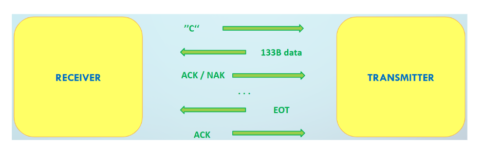 Once the receiver checks and validates the packet, it responds with either an ACK or NAK (in case of a non-valid packet), during which the transmitter will either send the following packet or resend the latest packet. This process continues until the receiver receives an EOT byte, which is then properly ACK-ed to the sender.