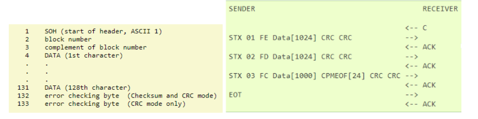 -SOH – start of header: 0x01-EOT – end of transmission: 0x04-ACK – acknowledge: 0x06-NAK – not acknowledge: 0x15-ETB – end of transmission block: 0x17-CAN – cancel (force receiver to start sending C’s): 0x18-C – ASCII “C” which means initiation of the start: 0x43